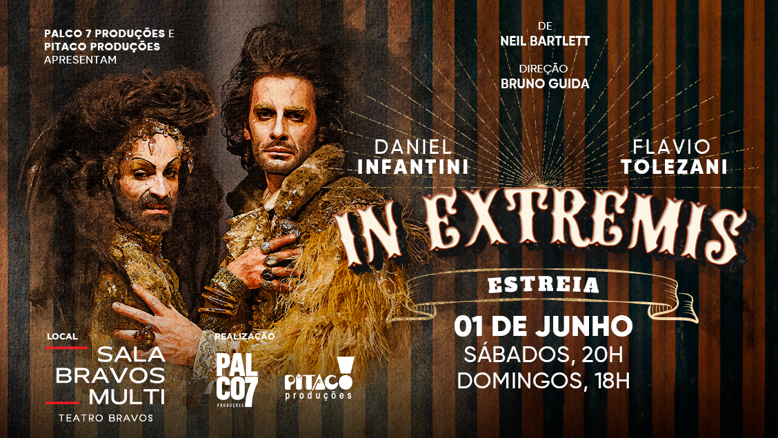 Uma experiência exotérica vivida pelo escritor irlandês Oscar Wilde (1854-1900) inspirou o premiado autor inglês Neil Bartlett a escrever a comédia dramática In Extremis, que teve uma montagem brasileira em 2015, dirigida por Bruno Guida. O espetáculo, estrelado por Daniel Infantini e Flávio Tolezani, volta em cartaz para uma temporada de reestreia no Teatro Bravos, entre os dias 1 de junho e 28 de julho, com apresentações aos sábados, às 20h, e aos domingos, às 18h.