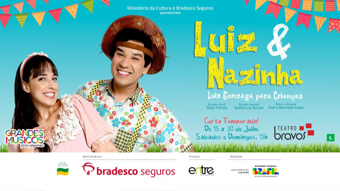Com direção de Diego Morais e direção musical de Guilherme Borges, Luiz e Nazinha – Luiz Gonzaga para Crianças conta passagens da infância de Luiz Gonzaga no interior do Nordeste, com destaque para a descoberta do amor, quando o jovem Luizinho (Pedro Henrique Lopes) se apaixona por Nazinha (Marina Mota), filha de um coronel que não permite o namoro deles. No elenco, também estão Erika Riba e Sergio Somene. O resultado é uma fábula de amor inocente, voltada para toda a família, embalada por grandes sucessos do músico, como “Asa Branca”, “Que Nem Jiló”, “Baião”, “O Xote das Meninas”, “Olha Pro Céu”, entre outros.