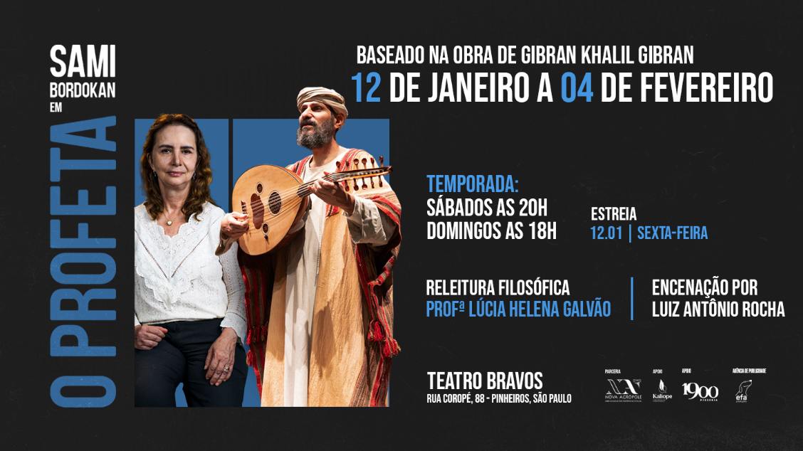 Depois do sucesso de público e crítica da montagem teatral: “Helena Blavatsky, a voz do silêncio”, a autora e filósofa Lúcia Helena Galvão repete a mesma parceria com o encenador Luiz Antônio Rocha. Em seu segundo desafio para teatro, faz uma releitura filosófica da obra do poeta libanês.