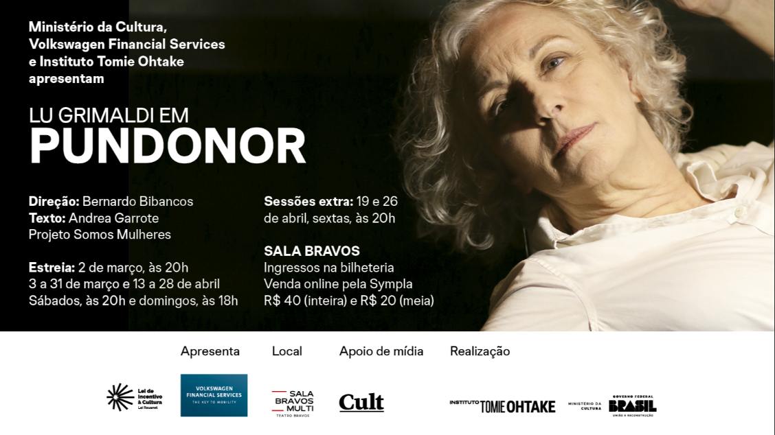 Após duas temporadas em cartaz na cidade, o espetáculo Pundonor (sm. Situação em que a honra e a dignidade são os pontos principais), estrelado por Lu Grimaldi, volta a ser exibido em São Paulo, a partir de sábado, 2 de março, na Sala Bravos Multi – Teatro Bravos (Complexo Aché Cultural, Rua Coropés, 88, Pinheiros), apresentado por Volkswagen Financial Services e com organização do Instituto Tomie Ohtake. Com direção de Bernardo Bibancos, a peça é baseada no premiado texto da autora argentina Andrea Garrote e discorre sobre a loucura e as estruturas de poder impostas à mulher.