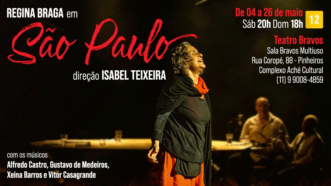 Quem ainda não assistiu tem agora uma última chance de ver o espetáculo São Paulo, estrelado por Regina Braga e dirigido por Isabel Teixeira. O espetáculo poderá ser visto em todos os sábados e domingos de maio (de 4 a 26), na Sala Multiuso do Teatro Bravos (Complexo Aché Cultural, Rua Coropés, 88, Pinheiros).