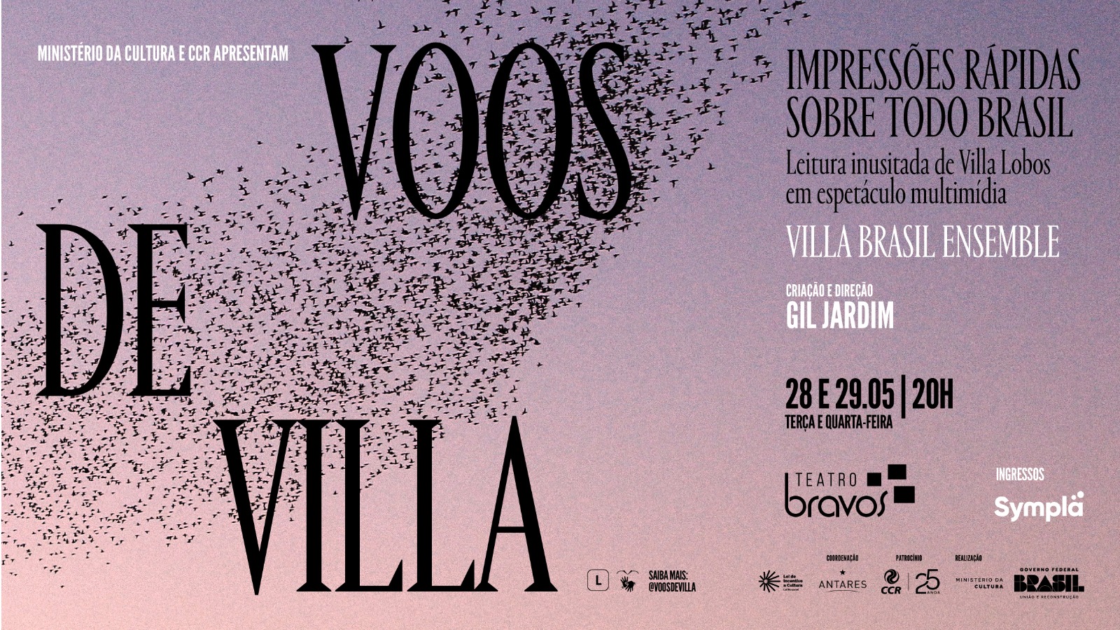 Essas palavras do Maestro Gil Jardim, resumem a importância de projetos que celebram ou apresentam aos diferentes públicos, a obra de Heitor Villa-Lobos. E nesse sentido, o espetáculo Voos de Villa – Impressões Rápidas sobre todo o Brasil, será apresentado nos dias 28 e 29 de maio, às 20 horas, no Teatro dos Bravos, em São Paulo, abrindo turnê nacional. Concebido para oferecer uma escuta renovada da música de Heitor Villa-Lobos, o concerto foi desenhado pelo maestro Gil Jardim com a parceria da designer de palco Anna Turra. Uma experiência multimídia, que explora as inúmeras formas de expressar a brasilidade que a obra de nosso maior compositor oferece. Após a capital paulista, a turnê segue para o Rio de Janeiro, Brasília e Belo Horizonte, com o patrocínio da CCR, através do Ministério da Cultura.